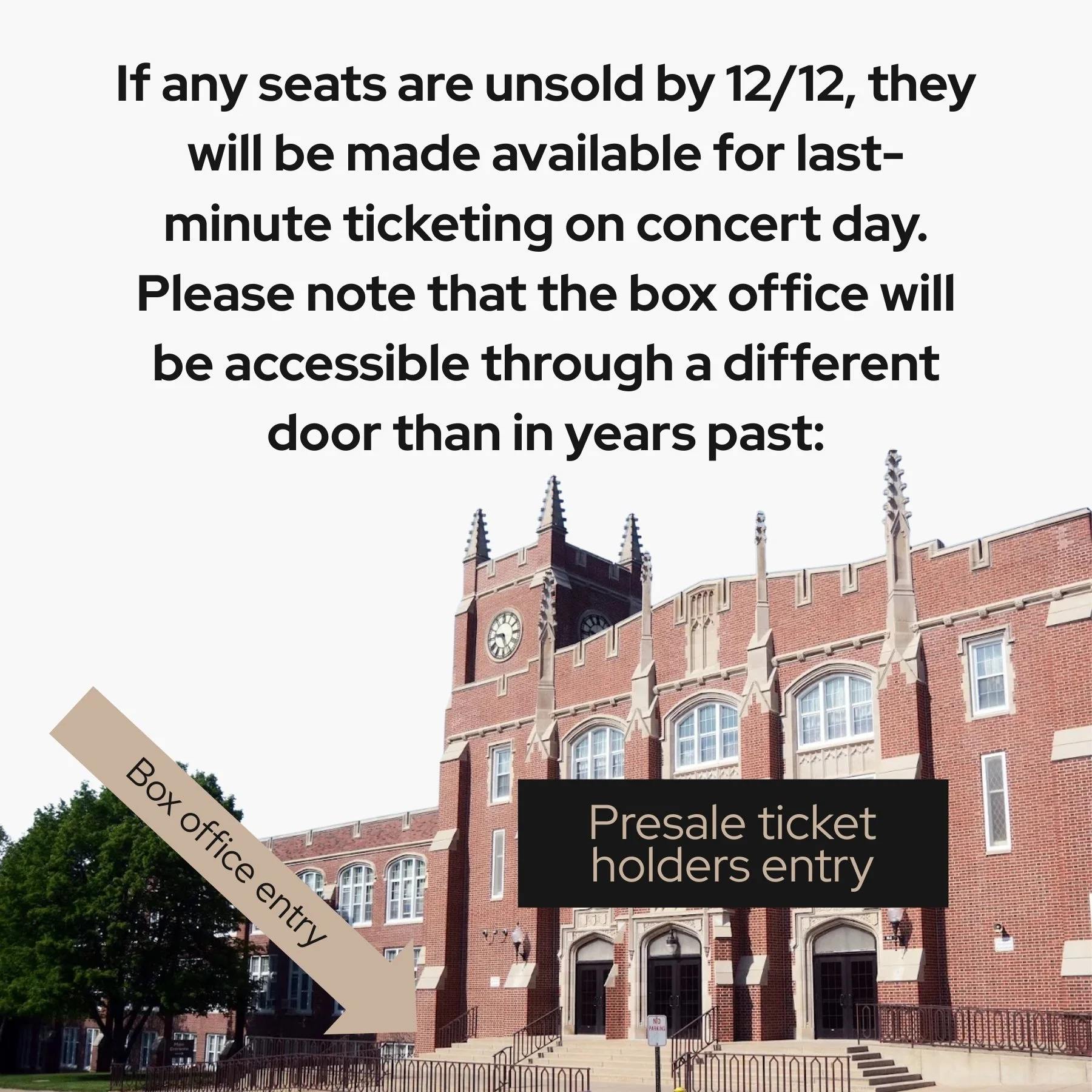 Due to high demand, tickets are only guaranteed to be available by presale (until tickets sell out). If there are any seats available still, limited ticket sales may be available on-site in the secondary lobby of Matthiessen Auditorium (see image below for reference). We recommend purchasing online at ivso.org or through the box office at 815-320-4471.